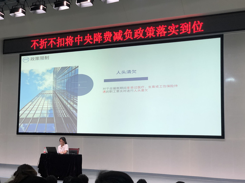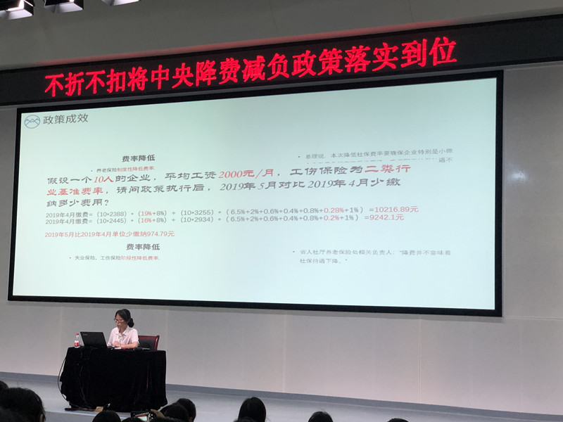 2019年5月14日下午2:00,在成都航空職業技術學院博學樓參加成都市龍泉驛區企業社保降費減負政策宣講會,會議由張晏榕主持,會議主要內容是社保政策背景、社保政策變更前及變更后對比降費幅度、企業緩繳政策解讀以及社保繳費申請手續。